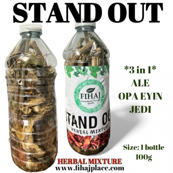 Organic Agbo Ale Jedi opa eyin Man power, also known as STANDOUT is a 3-in-1 mixture of herbs that consists of ALE, OPA Eyin, and JEDI. A mixture of various tree bark, roots, and dried leaves.