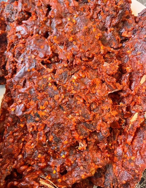 Kilishi meat is a beef jerky snack made from dried beef strips. This spicy Nigerian suya snack is rich in flavour and perfect for any occasion.